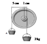 baskets of fruits hung by strings go around pulleys of different diameters as